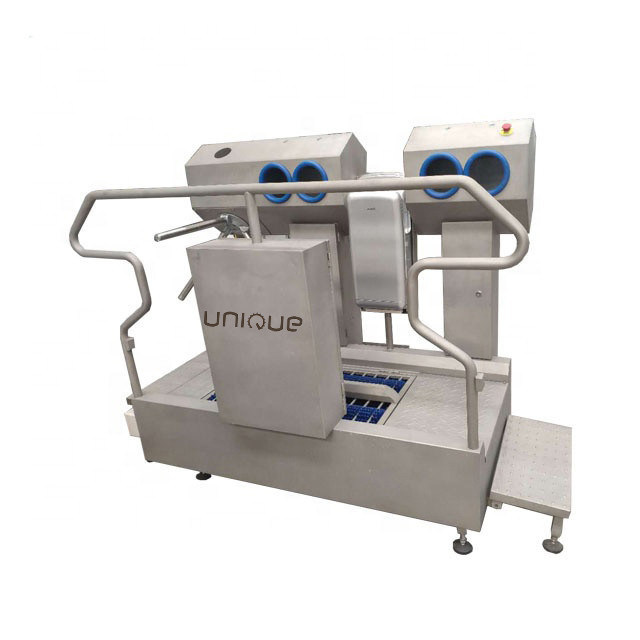 De schoenen- en handwasmachine is bedoeld voor het wassen van schoenen en het wassen van handen om de persoonlijke hygiëne te garanderen in een fruit- en groente- of vleesverwerkende fabriek.